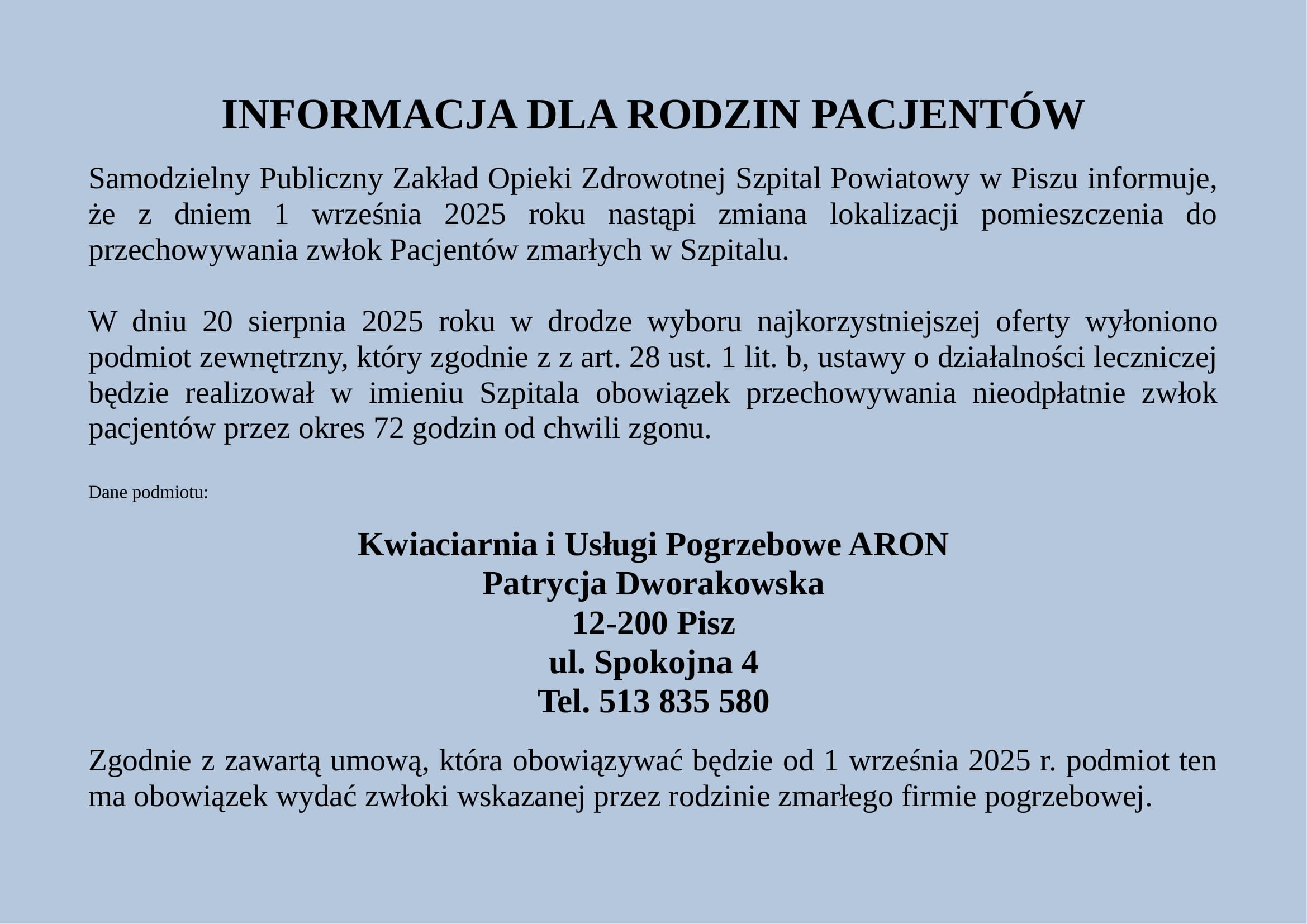Zmiana lokalizacji pomieszczenia do przechowywania zwłok Pacjentów zmarłych w Szpitalu